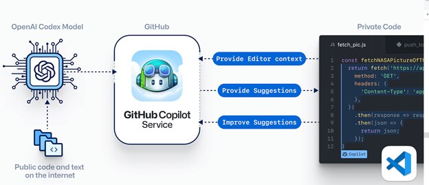 Figure 1: The architecture of Copilot showing how GitHub uses Codex under