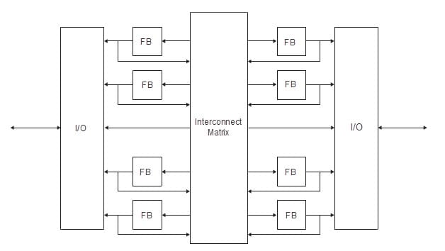 Although every CPLD vendor has its unique implementation, all CPLDs have the common characteristic of consisting of function blocks (FB), input/output blocks (I/O), and an interconnect matrix. CPLDs are programmed using elements specific to the technology of the manufacturer. The memory device can be EPROM cells, EEPROM cells, or Flash EPROM cells. Figure 2 shows the architecture of a typical CPLD.