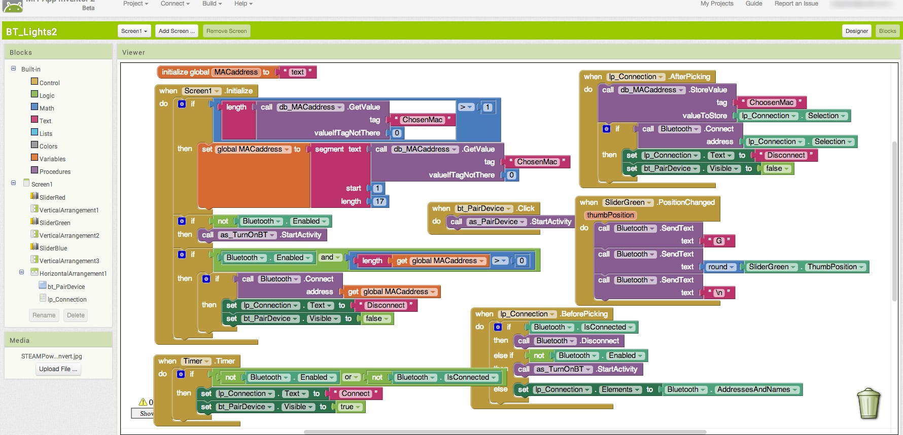 Okay, let’s log in to App Inventor. We start in the Designer mode to create our UI. I found this wonderful tutorial from Luis Picarzo on using Bluetooth and App Inventor, which formed the basis for this project. Code re-use! Another win for open source! For this project, I will use 3 sliders to control the intensity of each of the colors (Red, Green, Blue) of my LED strand. By mixing different values of color intensity, I can create quite a few different colors, just like pixels in your television, smartphone display, or computer monitor. I will also need to add some buttons to enable actions such as the Bluetooth pairing of my devices, establishing a Bluetooth connection, and disconnecting when I am done. There are also 5 non-visible components that need to be added to enable the functionality we are seeking. Non-visible components are the “behind-the scenes” parts of an app that the user interacts with indirectly, as compared to visible components such as buttons, sliders, and text fields. These non-visible components include TinyDB, Bluetooth Client, two Activity Starters, and a Timer. I also tweaked some UI settings such as shading each slider bar with the color it represents. When you are done, you will have this: