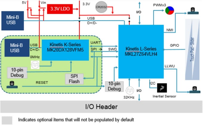 - 정전식 터치 슬라이더, 가속도계 MMA8451Q, 자력계 MAG3110, 3색 LED, 유연한 전력 공급 옵션: USB, 코인 셀 배터리, 외부 전원